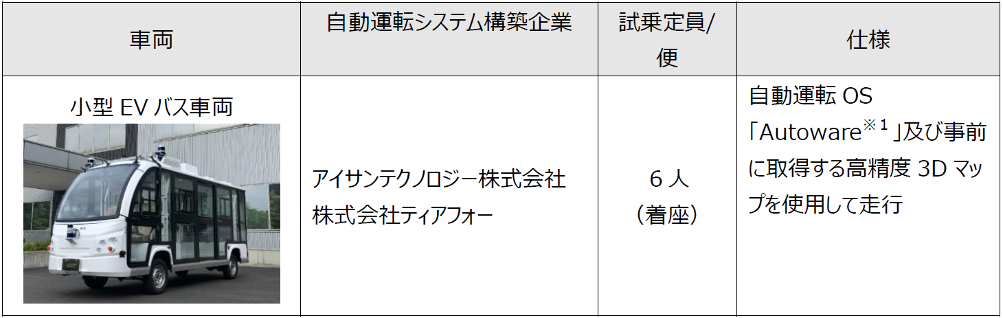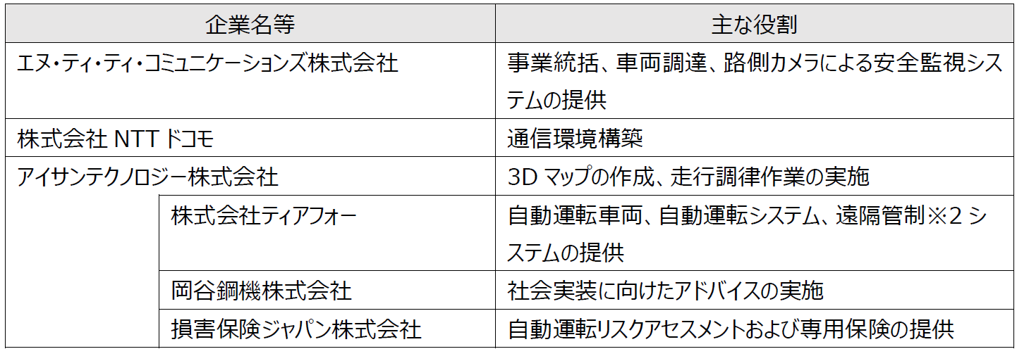 本年度は、実運行において交通事業者等により再現可能なビジネスモデルの完成度をさらに高めることを目指し、エヌ・ティ・ティ・コミュニケーションズ株式会社(本社:東京都千代田区、代表取締役社長:丸岡 亨)を幹事会社とし、株式会社ティアフォー(本社:愛知県名古屋市、代表取締役社長:加藤 真平)、岡谷鋼機株式会社(本社:愛知県名古屋市、取締役社長:岡谷 健広)、損害保険ジャパン株式会社(本社:東京都新宿区、代表取締役社長:白川 儀一)と共に、5社の共同体で愛知県より委託を受け事業実施いたしました。