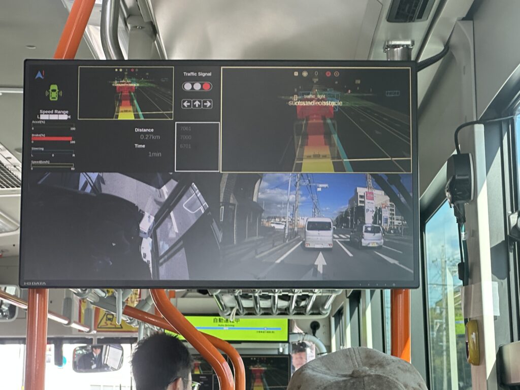 前方に設置された大型モニターには、現在の走行状況やセンサーによる周辺認識の情報が表示されています。映像には、障害物の検知や信号認識、車両前方のカメラ映像、さらにはアクセル・ブレーキ・ハンドルの操作状況までがリアルタイムで映し出され、運転席のドライバーによる“レベル2”の走行がどのように制御されているのかが一目で分かる設計です。自動化された部分と人の操作がどう連携しているのかが視覚的に確認でき、乗客にとっても安心感のあるシステムとなっています。