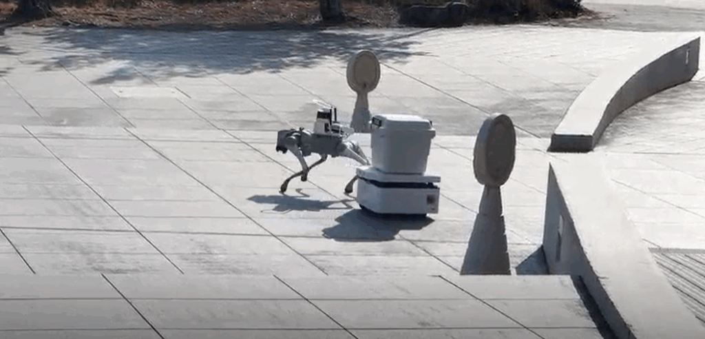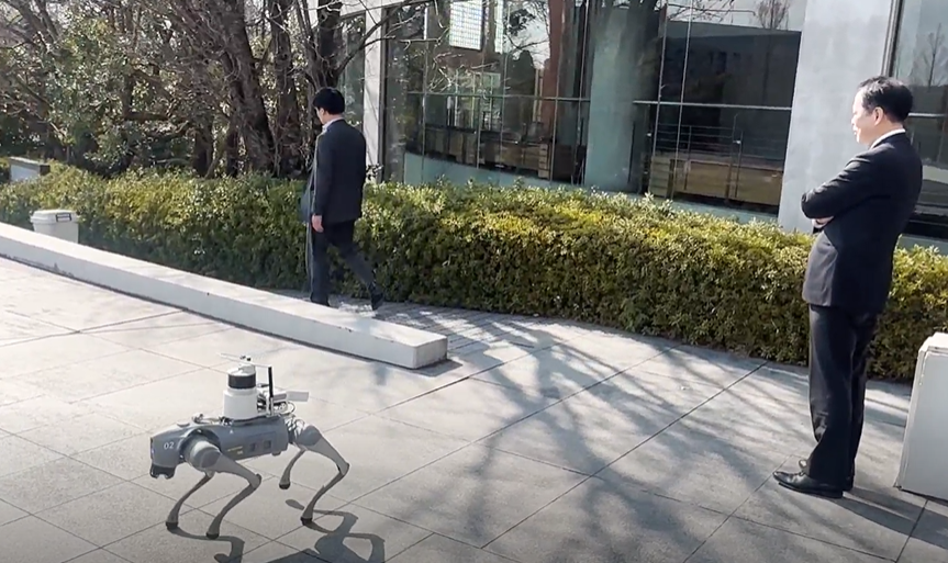 屋外動画では、四足歩行の警備ロボット「Pochi」と荷物搬送ロボット「KeiganALI」が互いの存在を認識し、経路を阻害することなく協調して走行する様子を確認できました。